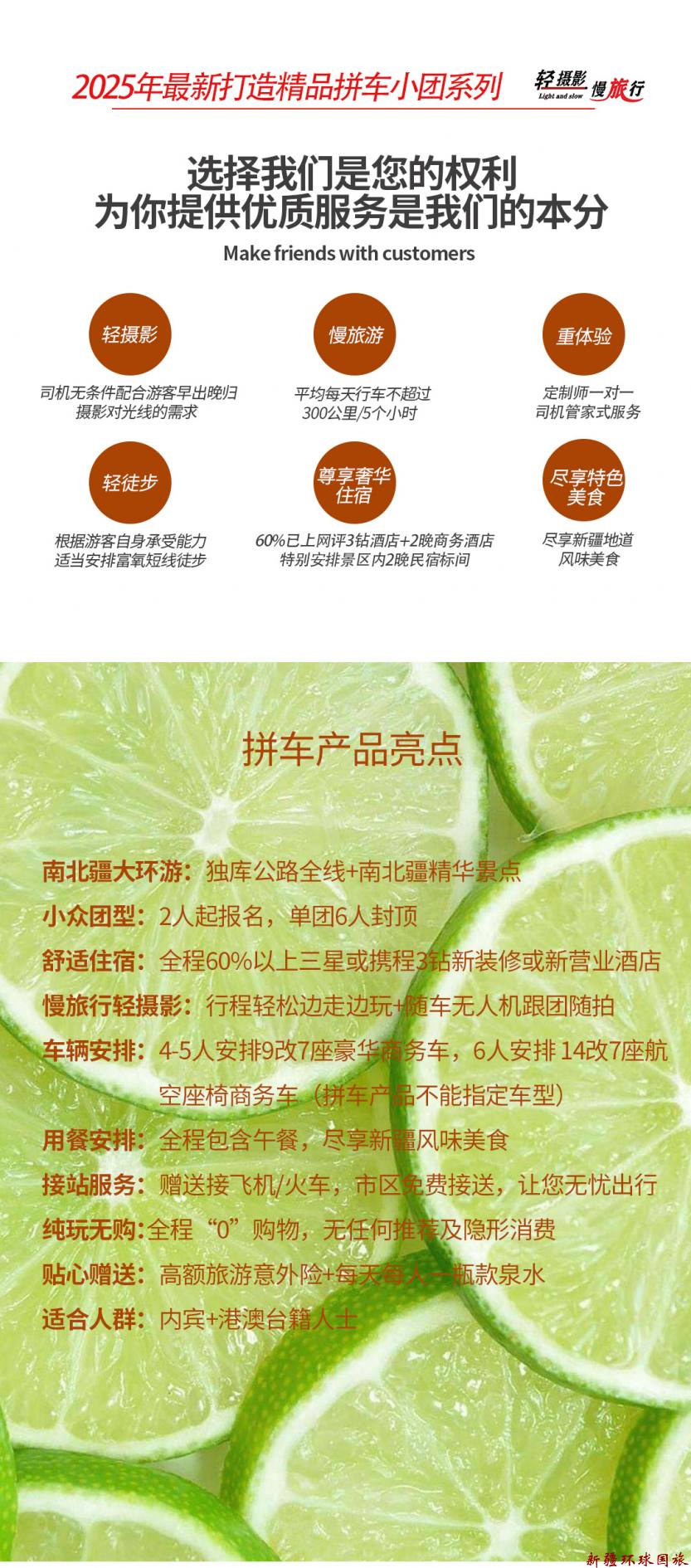 2、坐车指南:新疆地域辽阔,坐车时间长,请自备小零食,注意休息,保持体力充沛,以便能在新疆尽兴游玩